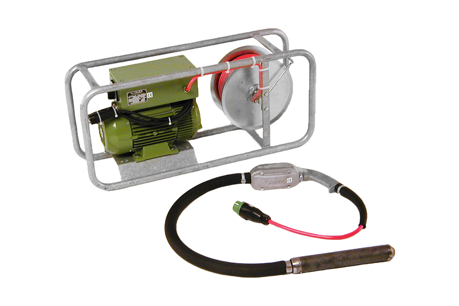 LAIER Immersion Vibrators with Handle are equipped with a 1 m long protective hose up to the site-proof switch box with handle. They are connected by a 20 m long especially flexible cable protected against bending and breaking, and a rubber plug. A motor of sufficient power and the special unbalanced design guarantee a constant compacting. A thermoprotector makes overloads or dry runs impossible.